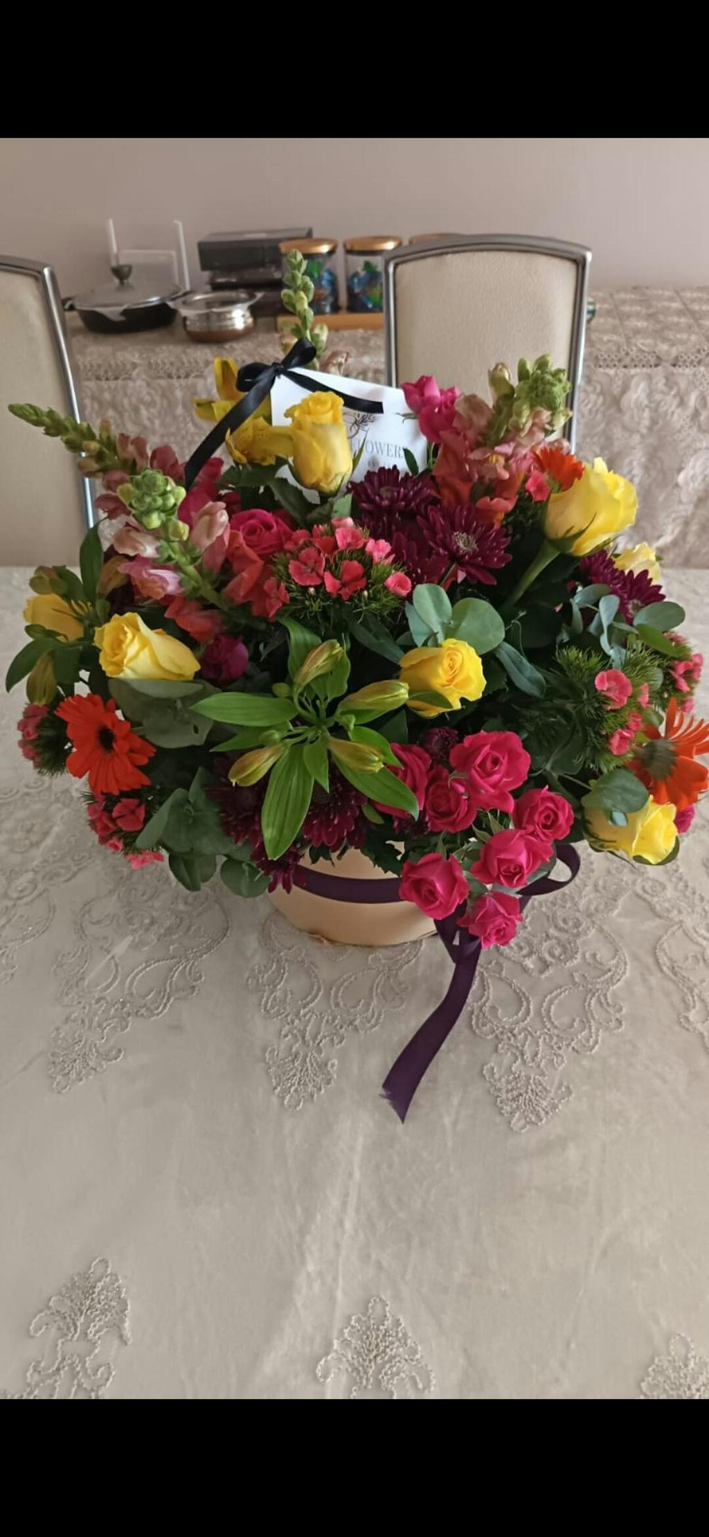 Keep your flowers in a cool area, away from direct sunlight, drafts, and heat sources. Avoid placing them near fruits, as some fruits release ethylene gas, which can shorten the lifespan of your flowers.