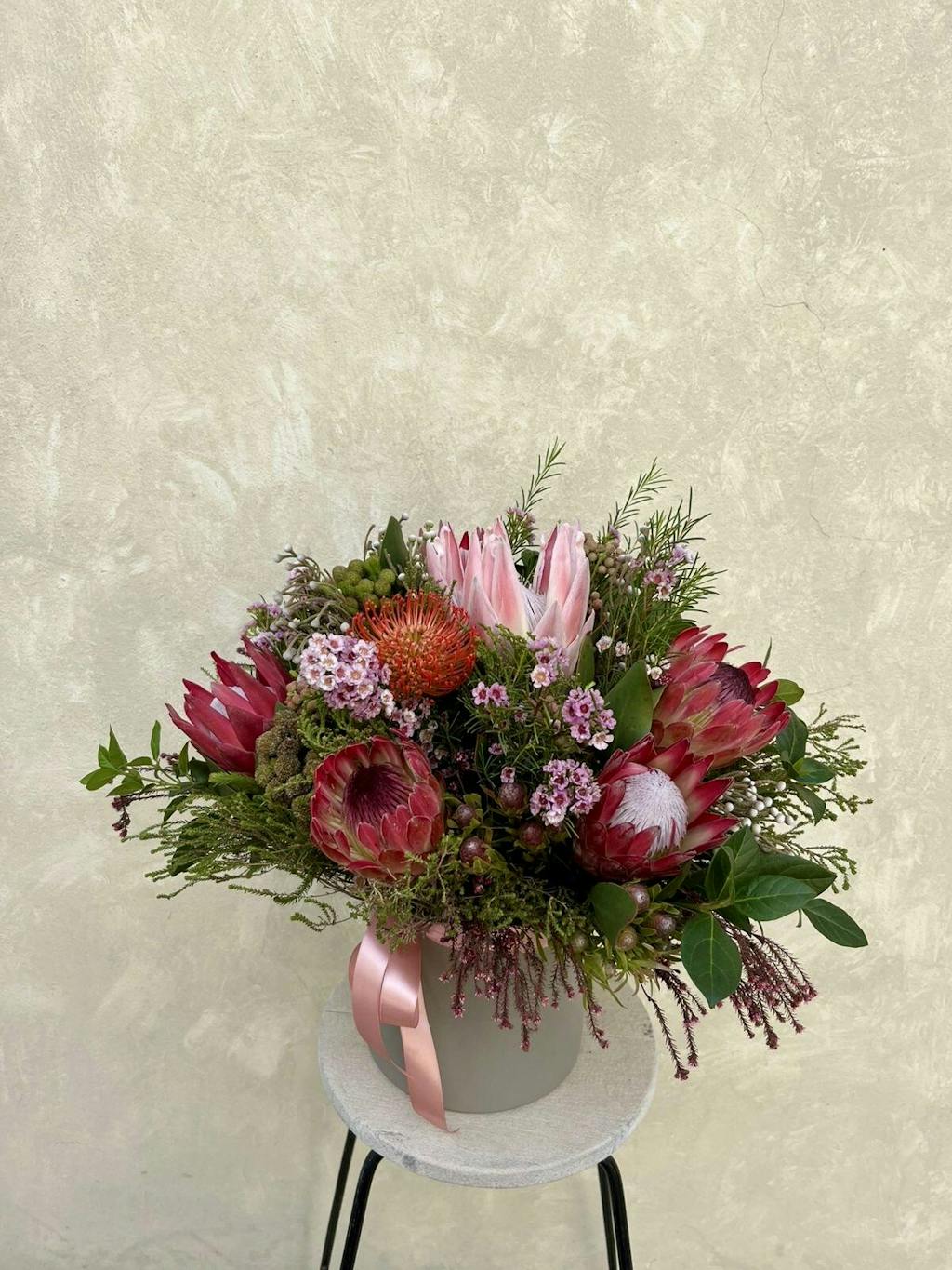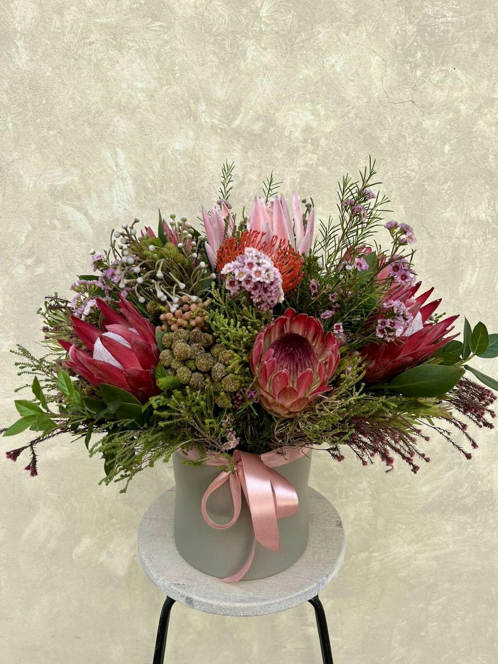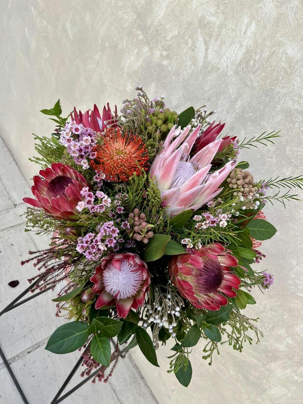 A bouquet of local seasonal proteas, indigenous flowers and greens. Picture is R1000 bouquet hand tied.