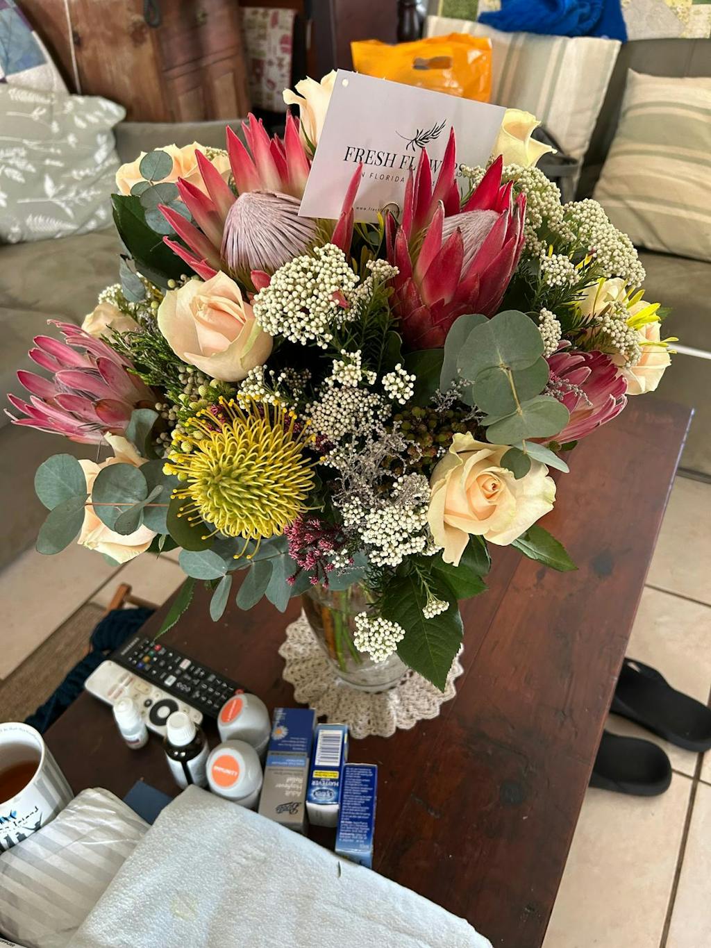 A bouquet of proteas, fillers & roses.